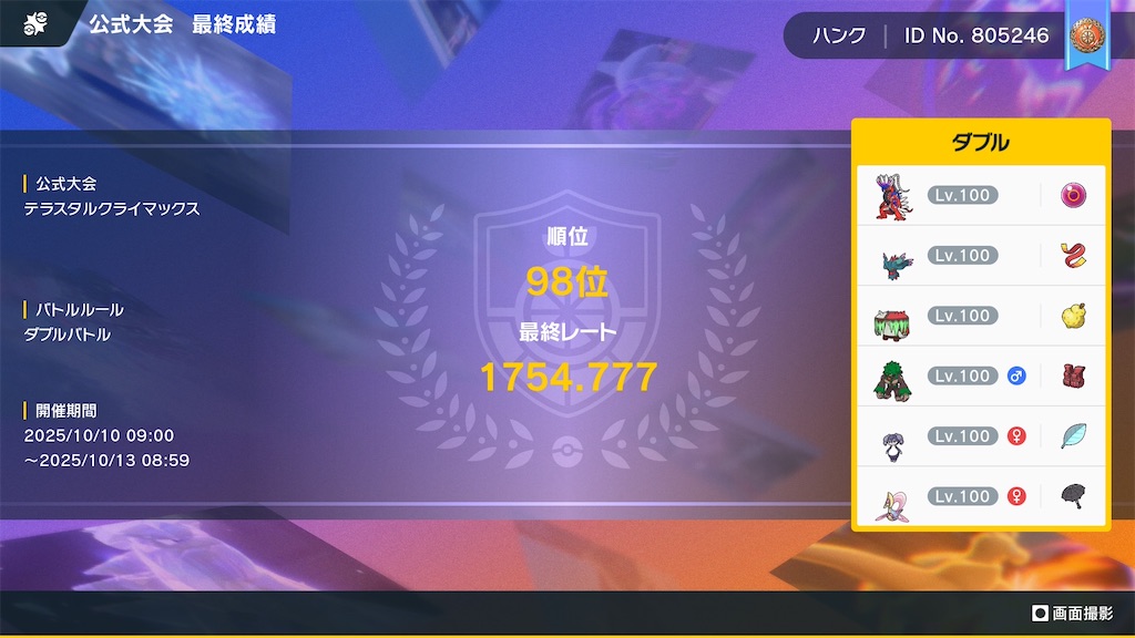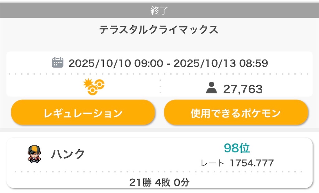 準備の段階からかなりのクソムーブをかましていた上に、大会中も同速とかお構いなしでコライドンで玉フレドラ連打みたいなチンパンプレイかましまくりで本当に終わってたなと思う。正直ここまでレート伸びたのも運だけマンだと思います。もしあるなら、チャンピオンズの仲間大会ではしっかり準備して臨みたいと思います。